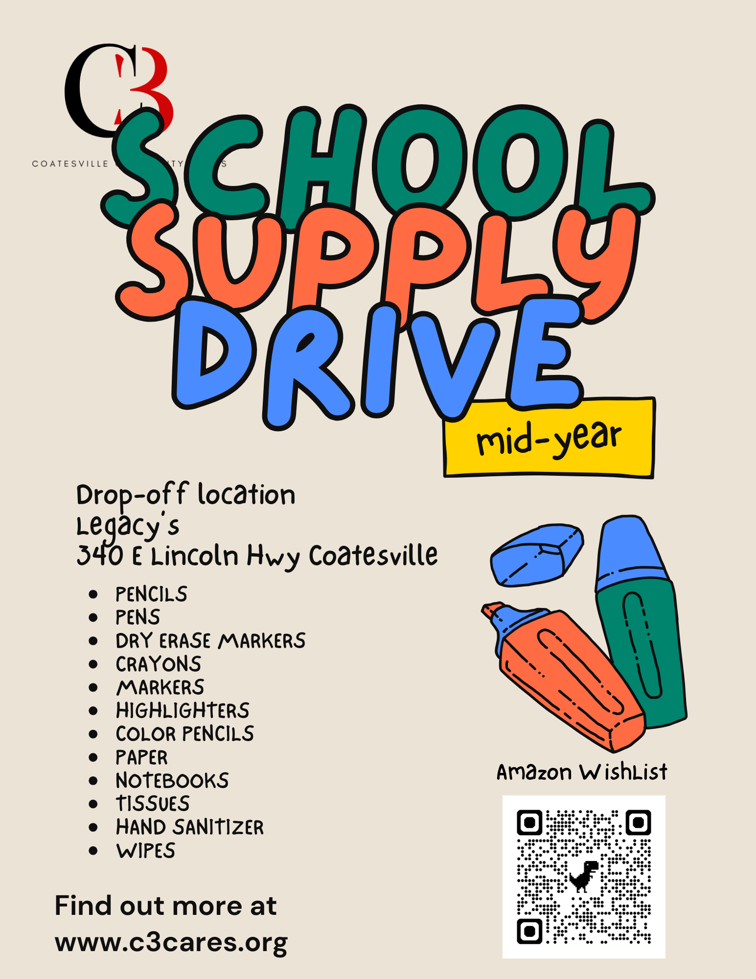 School supplies are needed year round. Help us restock as we plan for our mid-year school supply give-away. Link to Amazon wish list. Donations can be dropped off at Legacy's Resturant 340 E Lincoln Hwy Coatesville.